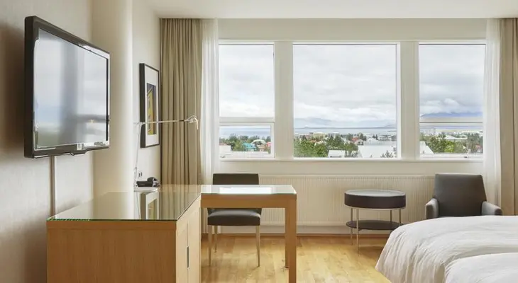 “The chic rooms are decked out with timber-beamed ceilings, Venetian fabrics, and marble bathrooms. Business and executive rooms...include free access to the exceptional Hilton Reykjavik Spa”