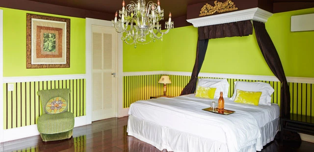 "Rio’s finest boutique hotel overlooks the exclusive Joatinga beach. Each of its seven rooms is painted a different color and has a lush marble bathroom to match."