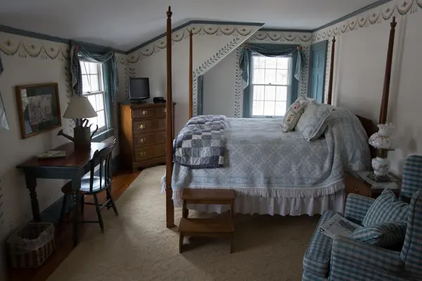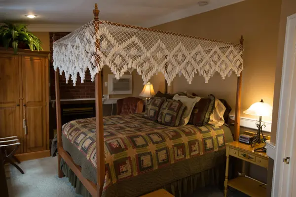 “Rooms are immaculate and decorated in historic country-cottage style with handcrafted and antique pieces. A bubbling creek with a waterfall runs alongside the inn, in view of the patio.”