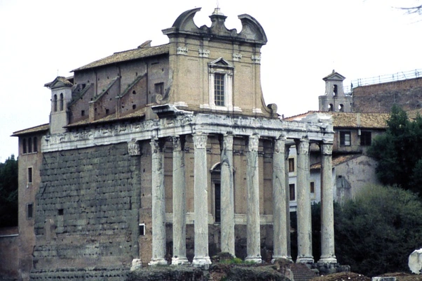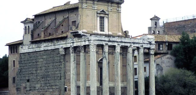“Erected by the Senate in honor of Faustina, deified wife of Emperor Antoninus Pius (AD 138–161), Hadrian's successor, this temple was rededicated to the emperor as well upon his death.”