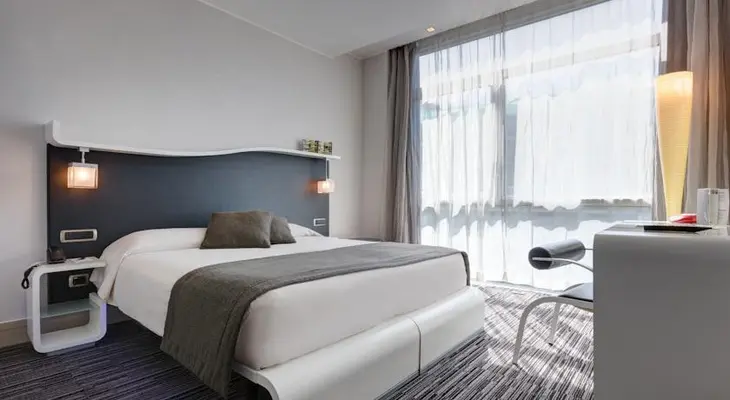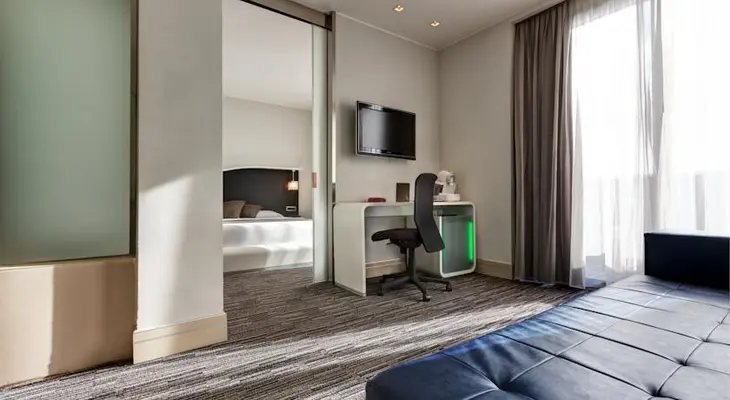 “The 118-room hotel is modern and stylish with funky furniture and tones of gray and white.”