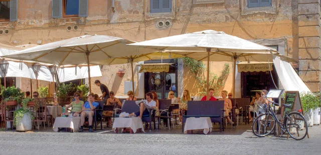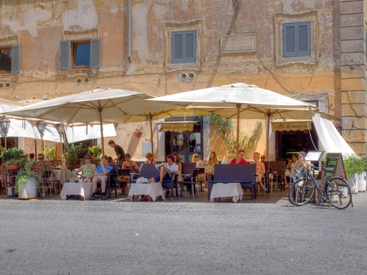 “Over a coffee or a cocktail, sit and gaze upon Santa Maria in Trastevere's glistening golden facade at Caffè di Marzio.”