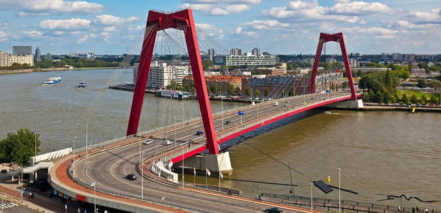“Rotterdam's second signature bridge, the 1981-opened Willemsbrug, makes a bold statement with its crimson-red pylons.”