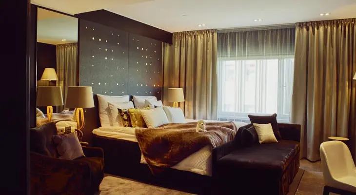 "Lapland's top hotel has handcrafted artworks adorning individually designed rooms (some with private saunas). Loft rooms have skylights for aurora-borealis views; the two apartments sleep four." Full review