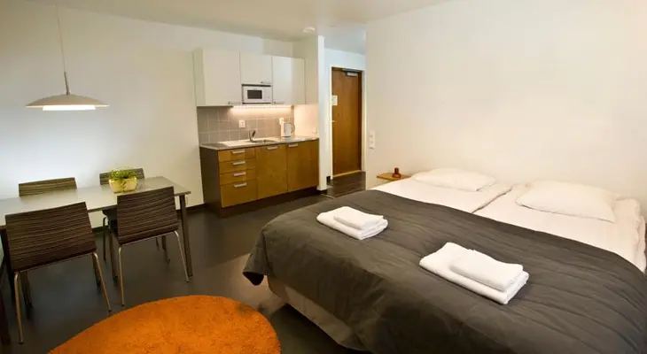 “Functional, modern rooms offer heaps of space and include fridge, microwave and drying cupboard; cheaper 'hostel' rooms share bathrooms. On site are a large swimming pool, spa facilities, bowling.”