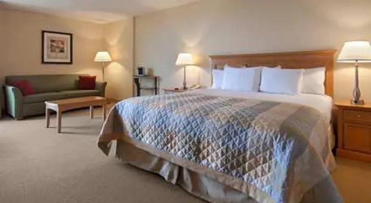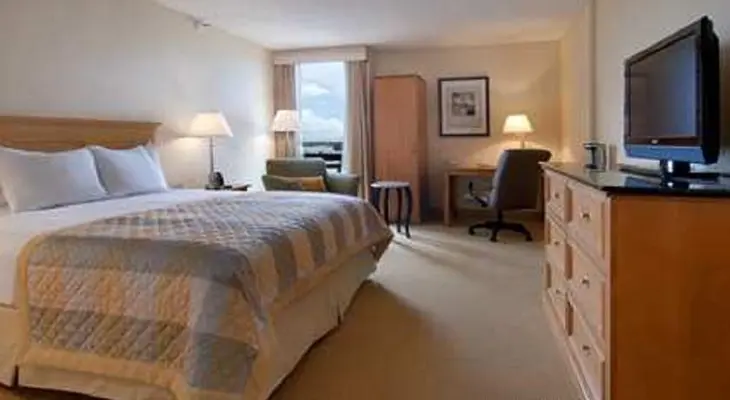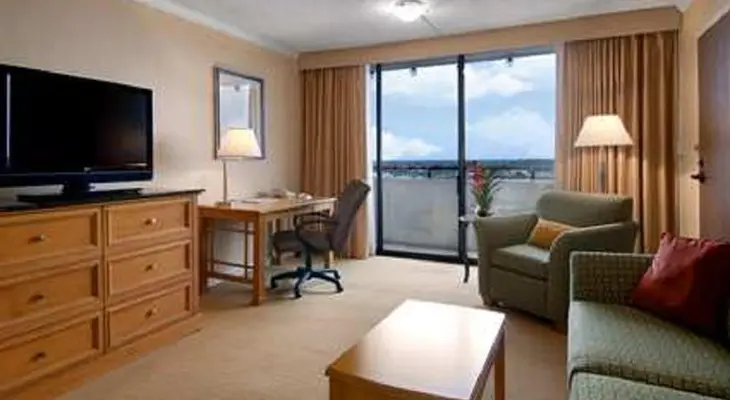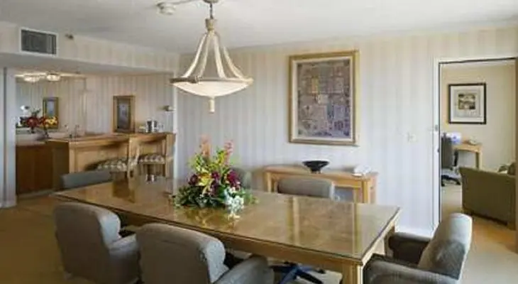 "Near the Arden Fair Mall and Cal Expo, this resort-style hotel features a heated outdoor pool and hot tub. Modern paintings and cherry furniture accent the sunny lobby."