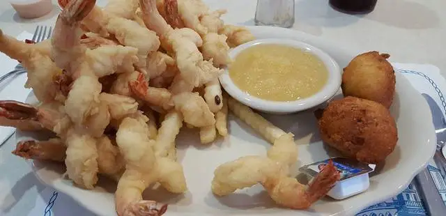“Across the Bridge of Lions from downtown, this hole-in-the-wall restaurant is recognizable for the line of customers who wait patiently for fried shrimp (the specialty).”