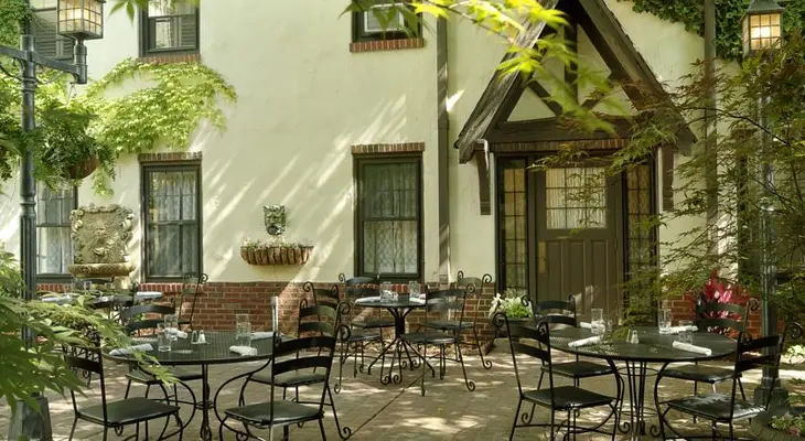 “This National Register-listed Tudor Revival apartment building in tony Clayton has been renovated and revamped as a countrified guest house.”