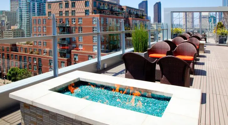 "Conveniently located near the Convention Center and Petco Park, this pet-friendly boutique hotel boasts a roof garden and Level 9 Rooftop Bar with cozy fire pits for chilly evenings"