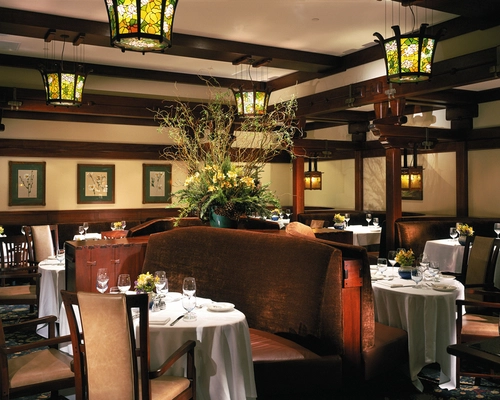 Inside, choose from one of the Craftsman post-and-beam dining rooms, warm with amber lanterns and stained-glass light fixtures; or simply head outside to dine on the patio overlooking the pool and 18th hole of Torrey Pines Golf Course.