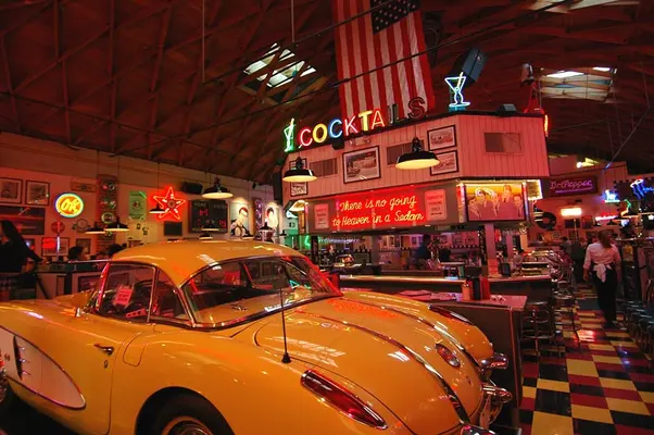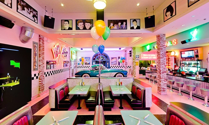 "A 1950s-style diner with all the trimmings like neon, jukeboxes, Corvettes, singing waitresses, shakes, burgers and fries." Full review