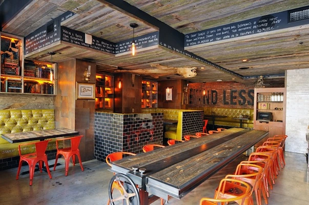 “Design-wise, books line the shelves, and quotes from classics are written in chalk across the walls and in pen on the olive-green banquettes. Taxidermy is a theme, too. ”