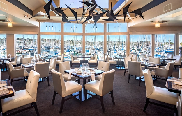 “California coastal cuisine complemented by floor-to-ceiling marina views.”