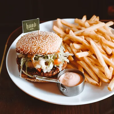 "Perfectly seasoned burgers topped with pickled daikon or spicy Cajun sauce, and served on artisanal buns."