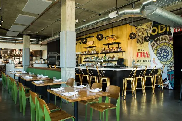 "Space is all concrete floors, wood panels, exposed pipes, and floor-to-ceiling windows; the bar, with its catchy metallic brass stools, and the bustling open kitchen beside it, function as eye candy." Full review