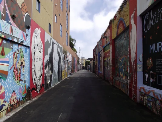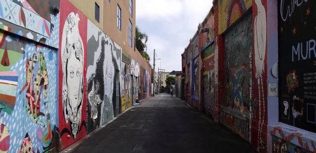 "Alley of vibrant, socially conscious community street art. Bring your camera."