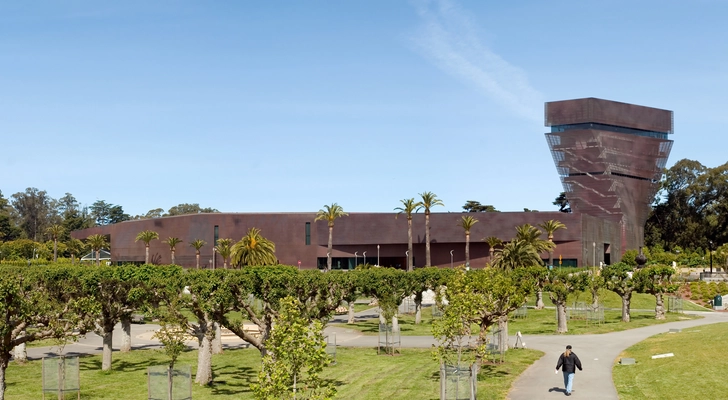 “The de Young Museum, with its perforated copper facade and spiraling tower in the center of Golden Gate Park, is as dramatic outside as it is inside.”