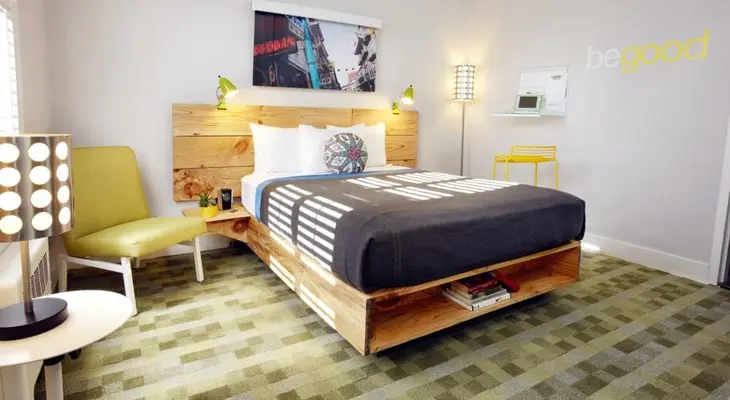 “This simple hotel plays to an under-30 demographic, with a dorm-room aesthetic and an emphasis on green.”
