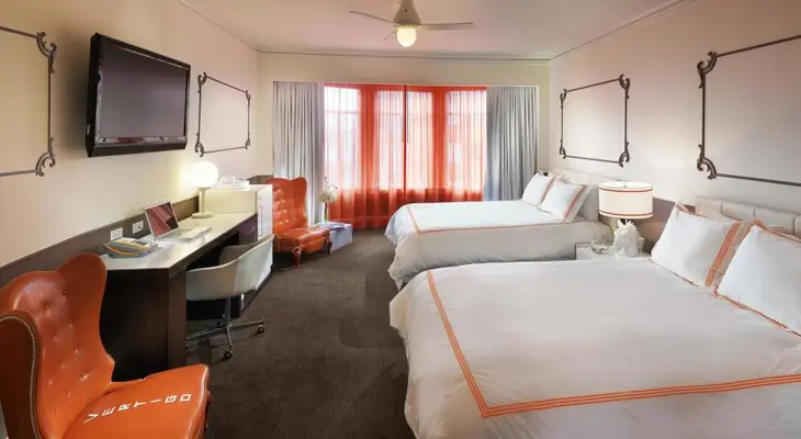 "Designed by Thomas Schoos, the rooms are also furnished with tilted horse head lamps, bright orange wingback chairs, and white leather headboards." Full review