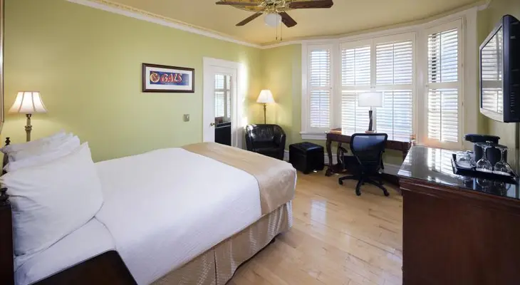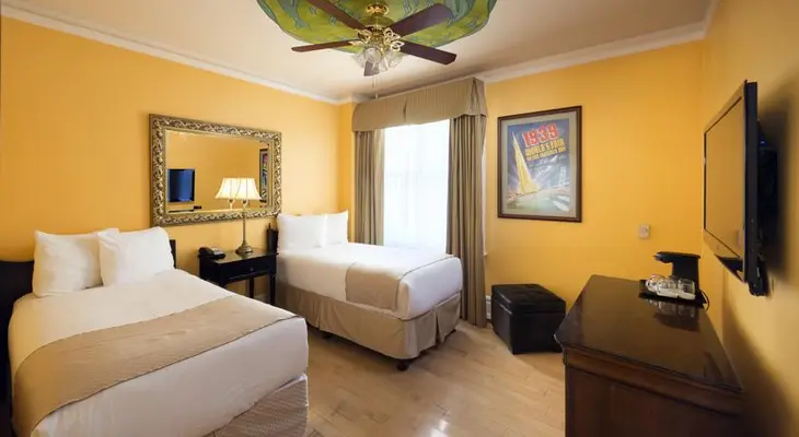 “This bay-windowed, vintage-1920s hotel has small rooms and sometimes-thin walls, but cheery yellow paint jobs, fluffy beds and double-pane windows that generally block street noise.”