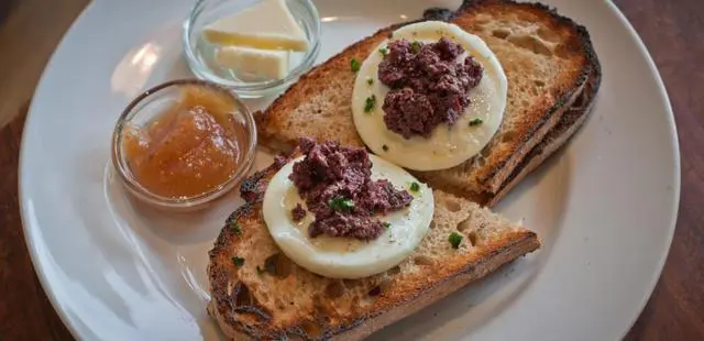“The kitchen poaches eggs in a retro Italian steamer, serving them with toasted whole-wheat sourdough bread and corned beef that's cured in-house.”
