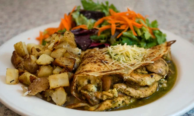 "Crepes are the way to go—the Kyoto, with grilled tofu and shiitake mushrooms, or the Santa Fe, chicken apple sausage and scrambled eggs."