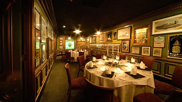 "Darkly lit ambience with clubby banquettes, wild game dishes like saddle of antelope and buffalo rib eye."