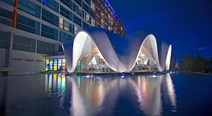 “Retro elements like the diamond-patterned facade and a restaurant inside a curving cement seashell feel at home among of-the-moment features like a multilevel pool.”