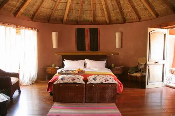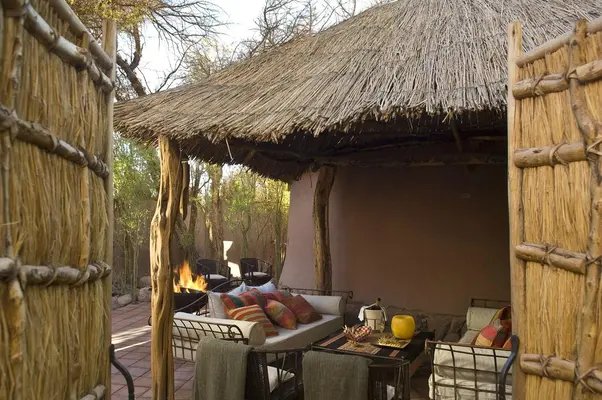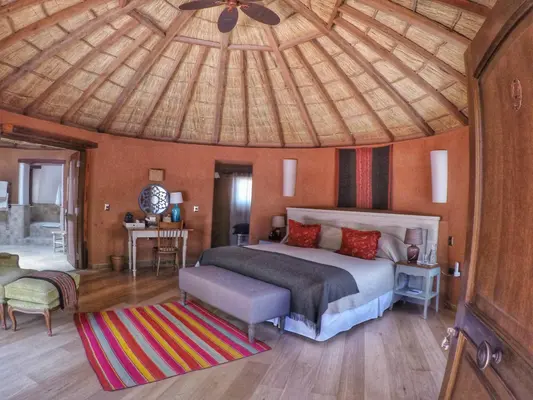 "A Chilean desert aesthetic that continues throughout the property, from the thatch-roof round guest rooms to the cocktail bar adorned with stones from the local river."