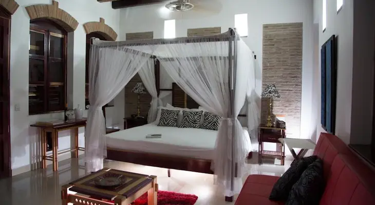 “A block away from El Parque de los Novios, a focal point of Santa Marta's nightlife, this small boutique hotel has a cheerful design and plenty of greenery in the courtyard.”