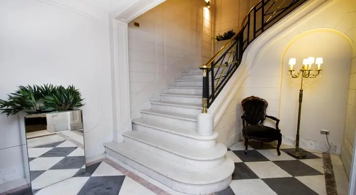 “Think grand marble staircases, creaking original parquet flooring and chandeliers.”