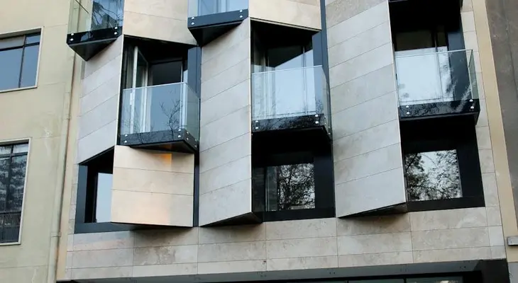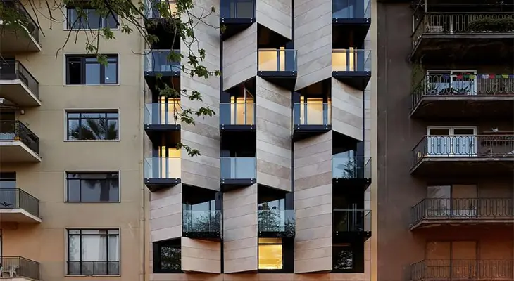 “Guest rooms in this tall, thin building are spread throughout nine floors, while communal areas include a basement restaurant, street-level café and lounge, and rooftop terrace with great views.”