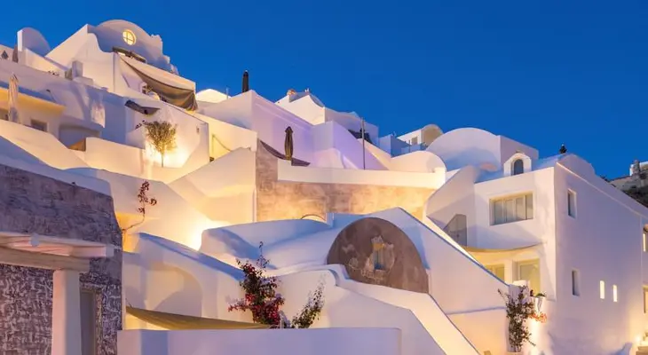 “Rock-hewn suites, private Jacuzzis and a candlelit restaurant make up this romantic retreat in Oia.”