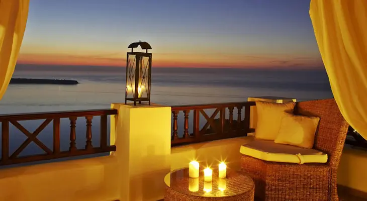 “A dual property with whitewashed Cycladic architecture, modern upscale decor, and gorgeous sunset views of the caldera, volcano, and Aegean Sea.”