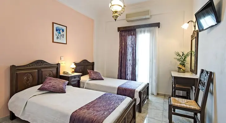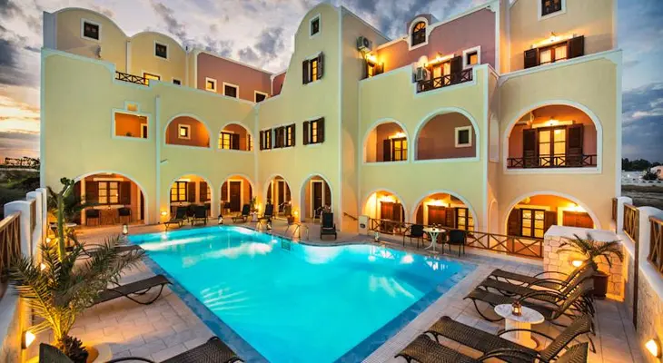 “This hotel (popular with Greek and foreign honeymooners) compensates for its lack of a caldera view with a large swimming pool and excellent location... Unusual in Greece are the nonsmoking rooms.”