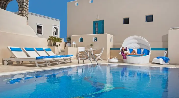 “Evgenia Villas & Suites is a small three-pearl, family-friendly hotel within walking distance of Fira.”