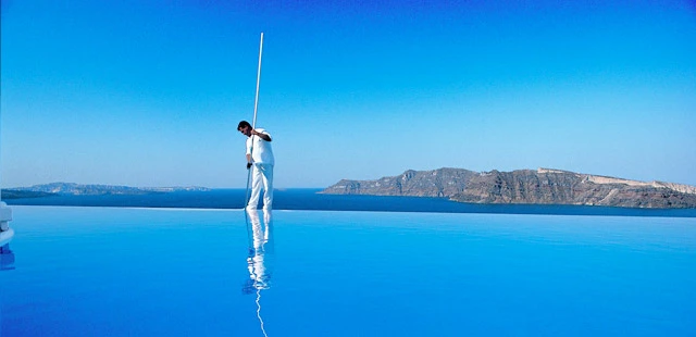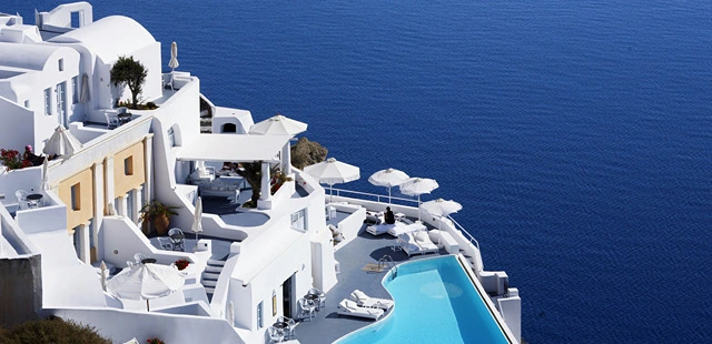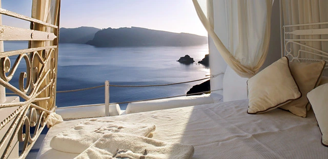 "Built atop a cliff overlooking the Santorini caldera basin, Katikies Hotel is renowned for its sweeping views of the Aegean Sea and the island's colorful sunsets." Full review