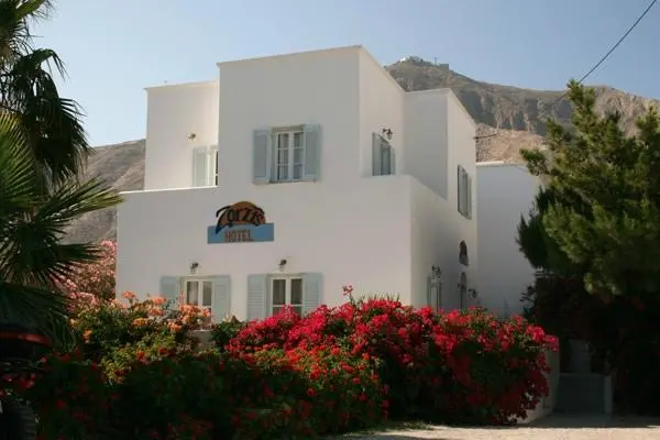 "Behind a huge bloom of geraniums on Perissa’s main street, Hirohiko and Spiros (a Japanese-Greek couple) run an immaculate 10-room hotel." Full review