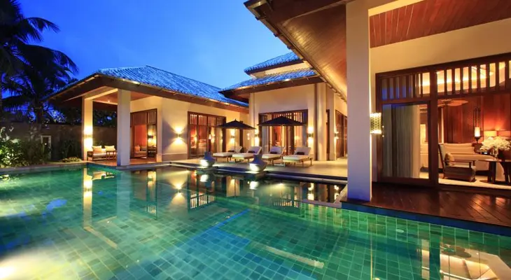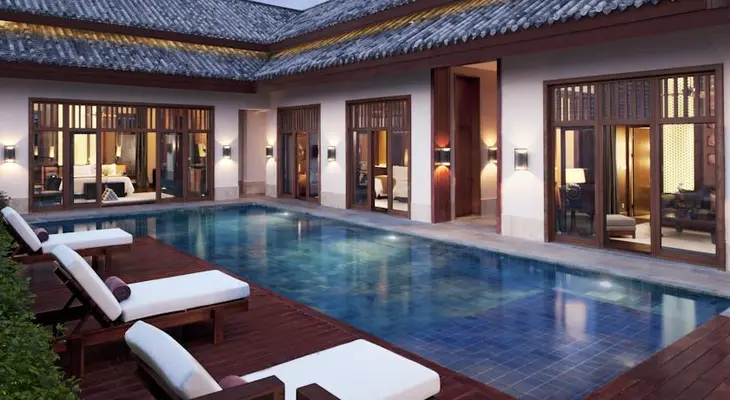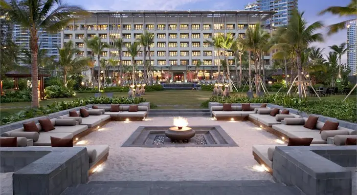“Thai-style tropical retreat with a hammock-strung private beach on the south coast of China's Hainan Island.”