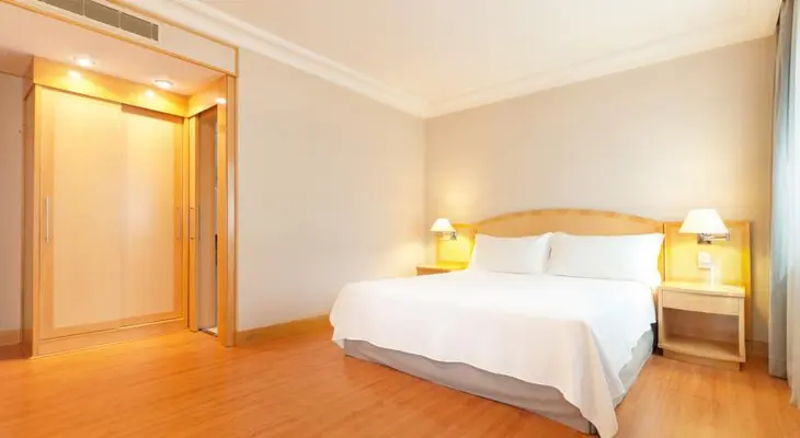 “Rounded, wooden headboards and shelves give rooms a sense of space, carpet is super clean; wood floors and balcony are also offered.”