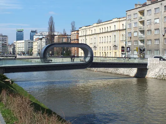 The Festina Lente footbridge crosses the Miljacka River with an Escher-esque 'loop-the-loop' in its centre. The name means 'Hurry Slowly', an aphorism often used to sum up the Bosnian attitude to life. — Lonely Planet