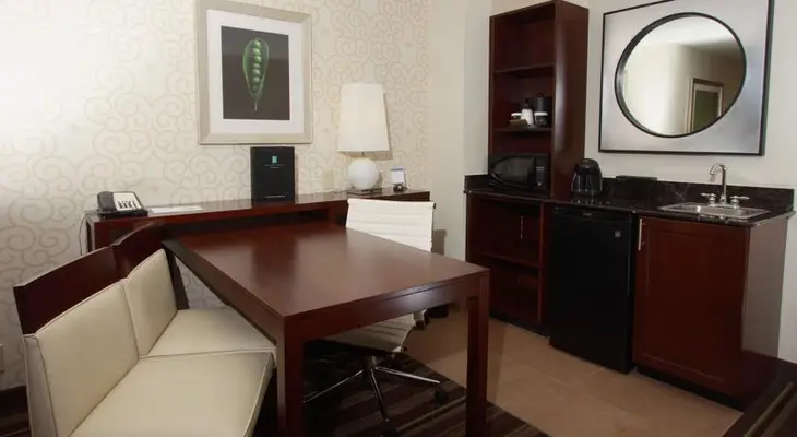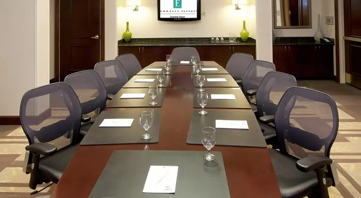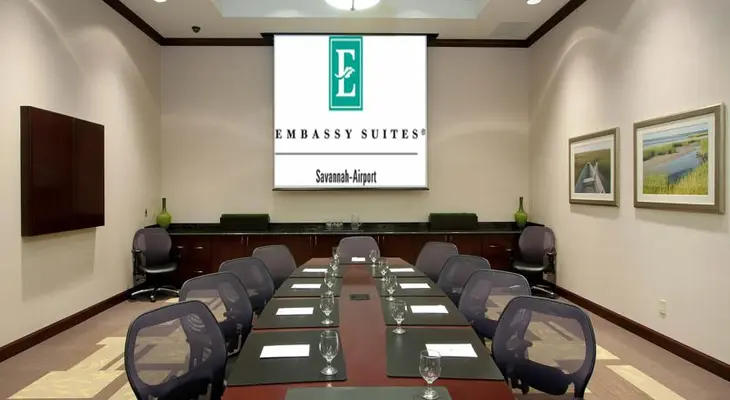 “The 162-room Embassy Suites Savannah Airport is an upper-middle-range chain hotel about five minutes from the airport.”