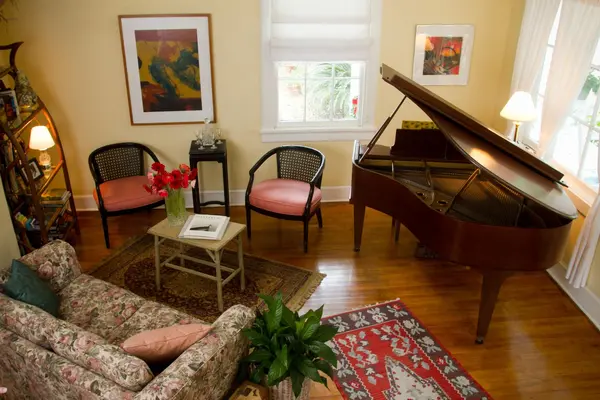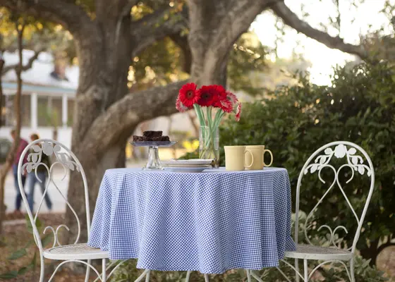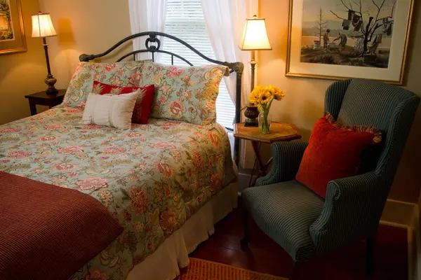 “This yellow-and-white frame house is a quiet getaway, a place to unplug and renew, to sit on the front porch and make the rocker creak while watching the sun drop.”