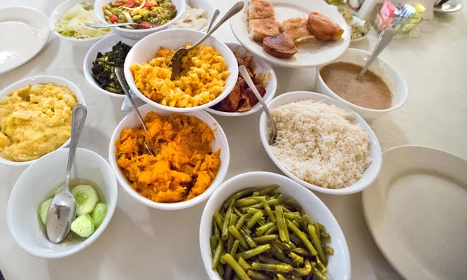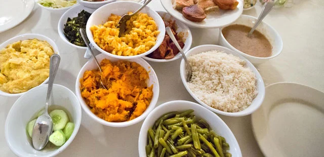 "Southern-style eating where guests share tables for up to 10 people. Serving lunch only, the entire spread which changes regularly and includes staples like grits, cornbread, okra, fried chicken"
