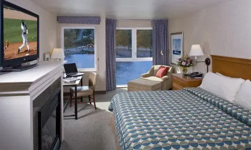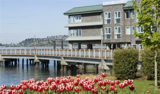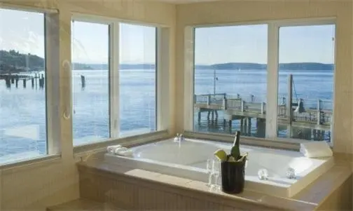 “Built out over the waters of Commencement Bay, on a pier on the Ruston Way waterfront, this hotel has water views from every room.”