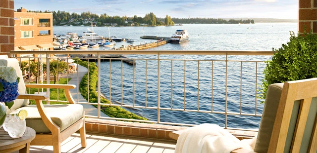 "Not only does this elegant hotel boast views of Lake Washington, it overlooks the Seattle skyline and the Olympic Mountains in the distance."