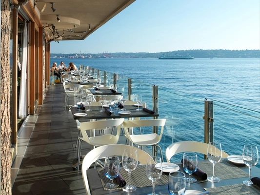 "The floor-to-ceiling windows offer a spectacular view of Elliott Bay and the Olympic Mountains. Dine on elegant New American dishes by chef John Roberts. B, L, and D." Full review