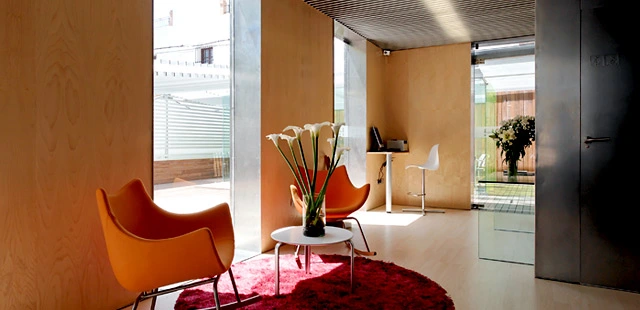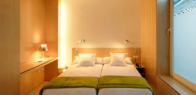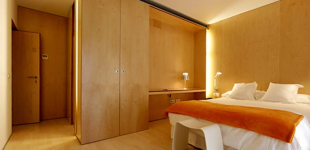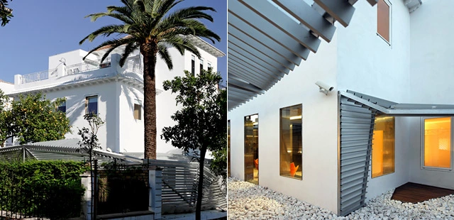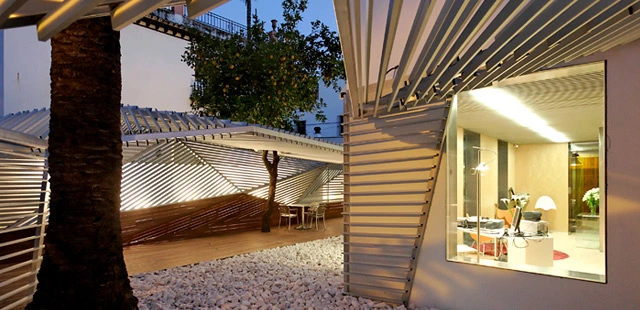 “The Hotel Holos is a modern, upper-middle-range, B&B with seven rooms in a residential house retrofitted with contemporary geometric architecture.”