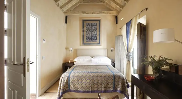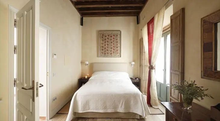 “Tucked away in one of the labyrinthine narrow streets of Seville’s old quarter, this whitewashed boutique hotel is a reinvention of a 17th-century casa palacio that preserves Roman marble pillars.”