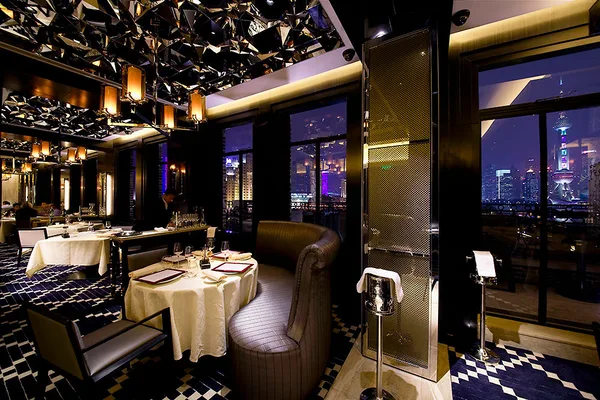 Shanghai’s first fine-dining Western-style restaurant, framed against the pink TV tower and other kitschy buildings of Pudong across the Huangpu River. — Travel + Leisure